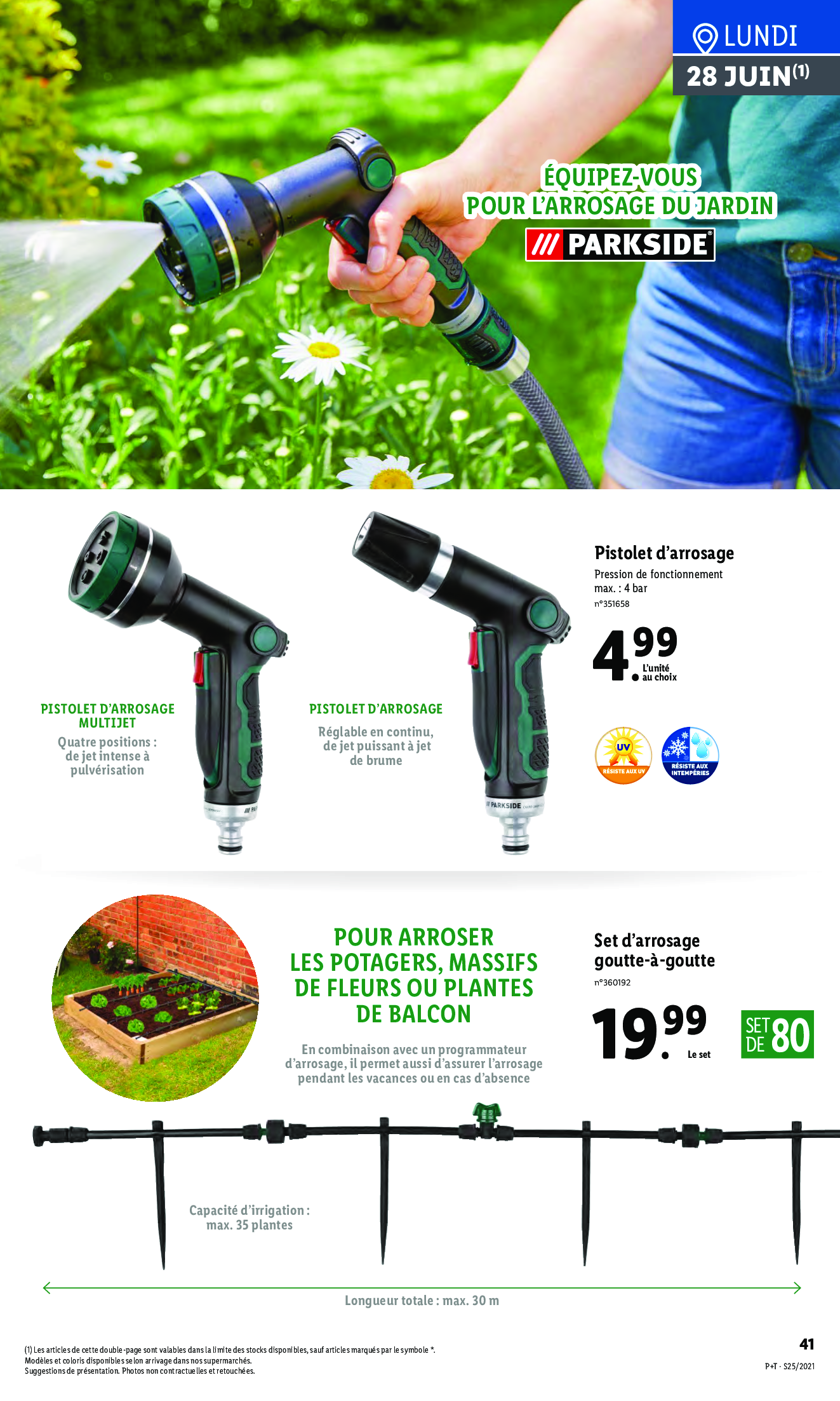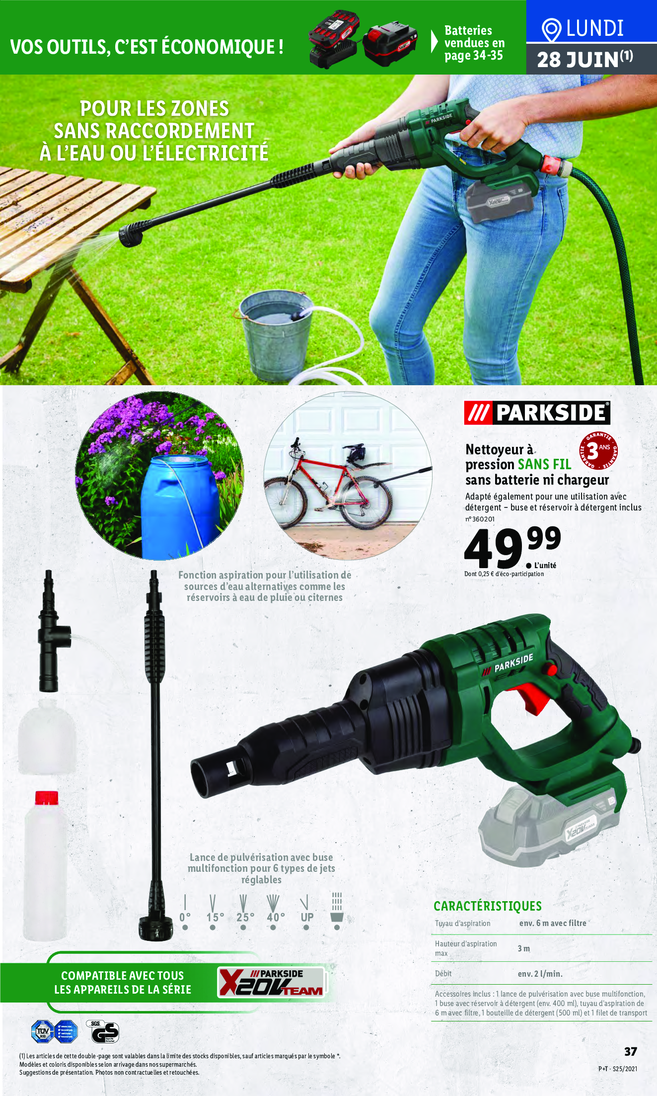 Arrivage Lidl catalogue bricolage outils Parkside X20V du lundi 28 juin 2021 avec les batteries 20V 4Ah, 2Ah et chargeur 2,4A, la scie sabre sans fil, lames de scie, la ponceuse excentrique sans fil, la meuleuse d’angle, le tailles-haies-électrique sans fil, le coupe-branches sans fil, le nettoyeur à pression sans fil, set d’embouts, douilles, mèches, forets, arroseur canon ou oscillant, pistolet d’arrosage, arrosoir, …