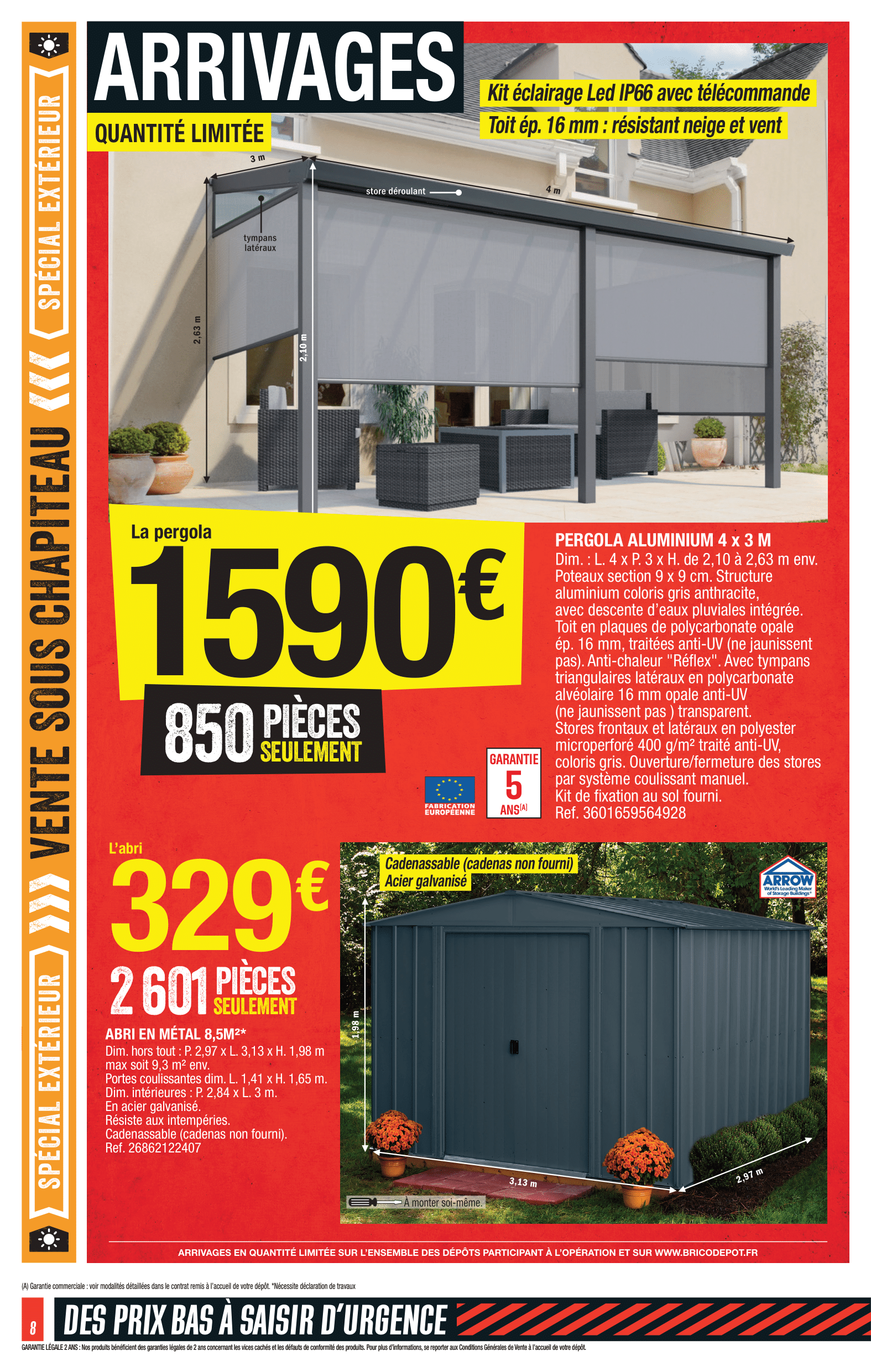 Produits disponibles chez Brico Dépôt : – TONDEUSE THERMIQUE TRACTÉE 196 CM3 – OUTIL MULTIFONCTION 32,6 CM3 – 4 EN 1 : Débroussailleuse, Coupe-bordures, Élagueuse et Taille-haies – GAZON ARTIFICIEL – COFFRE – BARBECUE CHARBON / BARBECUE GAZ – PERGOLA, BARNUM – CARRELAGE – ÉCHAFAUDAGE – MOBILIER DE JARDIN