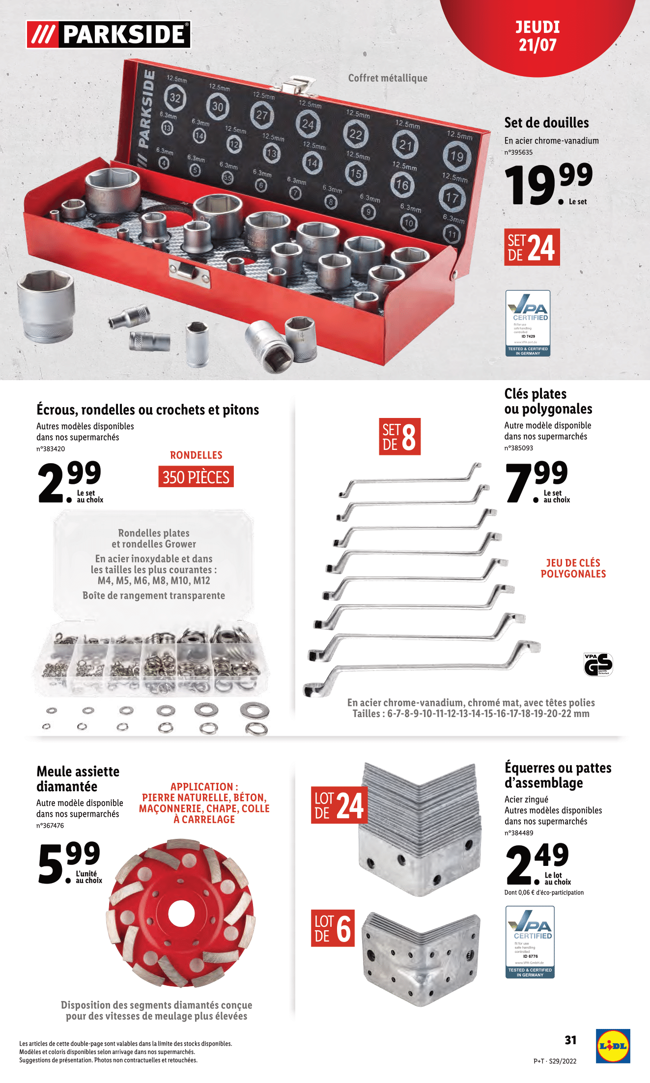 QQuoi de neuf chez Lidl ce jeudi 21 juillet 2022 ? – Perceuse-visseuse sans fil Parkside et accessoires – Batterie Parkside 20V 4ah – Chargeur Parkside 20V 4,5ah – Aspirateur eau et poussière sans fil Parkside sans batterie ni chargeur – Tronçonneuse sans fil 20 V Parkside sans batterie ni chargeur – Pistolet à colle Parkside – Bâtons de colle – Projecteur à LED – Serre-joints à une main – Tronçonneuse à métaux Parkside – Set de tournevis et embouts Parkside – Chevilles, clous ou vis pour aggloméré – Set de mèches à spirale – Accessoire de ponçage – Ruban adhésif – Set de douilles Parkside – Écrous, rondelles ou crochets et pitons – Clés plates ou polygonales – Meule assiette diamantée – Équerres ou pattes d’assemblage