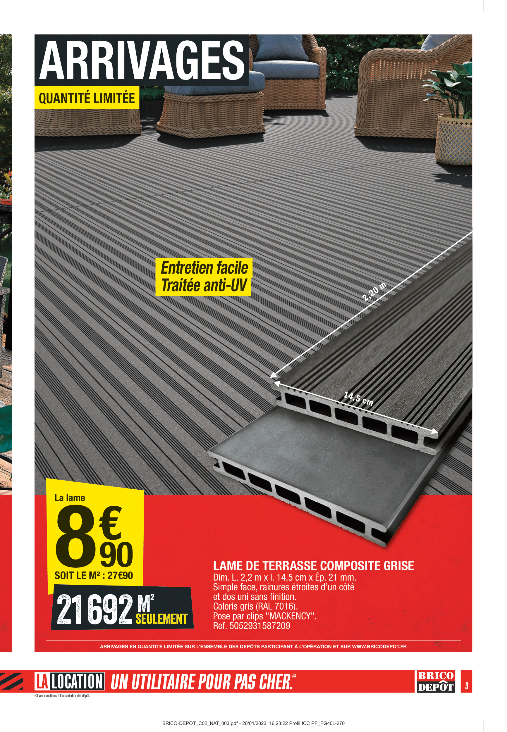 Salut la compagnie, C’est parti pour découvrir le nouveau catalogue brico dépôt du vendredi 24 février au jeudi 9 mars 2023. On commence avec le salon de jardin « venezia » idéal pour les après-midi ensoleillé ! Toujours à l’extérieur, brico dépôt nous propose ses lames de terrasse composite grise Lot de 5 stabilisateurs de gravier gris, bordure pvc universelle noire et stabilisateur multi usage seront également de la partie. Côté outillage brico dépôt nous proposera le nettoyeur haute pression électrique 2200 w 160 bar ainsi que la tondeuse thermique autotractée 196 cm3. On poursuit avec les panneaux acoustique, porte pivotante et colonne blanche 4 cases Attention où vous mettez les pieds, sol stratifié et carrelage de sol intérieur et extérieur seront au rendez-vous dès ce vendredi 24 février ! Rapide coup d’oeil sur ce lave-vaisselle encastrable pouvant accueillir jusqu’à 14 couverts. On continue avec les couronnes de câble et chauffe-eau électrique Coté équipement de travail seront présents chez brico depôt : le pantalon de travail, la veste de travail et les chaussures de sécurités s3. Compresseur coaxial moteur 2 chevaux + accessoires sera de retour en rayon tout comme l’aspirateur karcher eau et poussière 1 000 w. Enfin, on termine ce catalogue avec l’abri en métal de 8,5m2 Eh bien voilà on a fait le tour de ces arrivages brico depot du vendredi 24 février au jeudi 9 mars 2023. Comme d’habitude, j’ai épinglé les alternatives aux produits de ce catalogue sur ma vitrine Amazon, n’hésitez pas à jeter un œil, le lien est dans la description. En attendant je vous dis à la prochaine