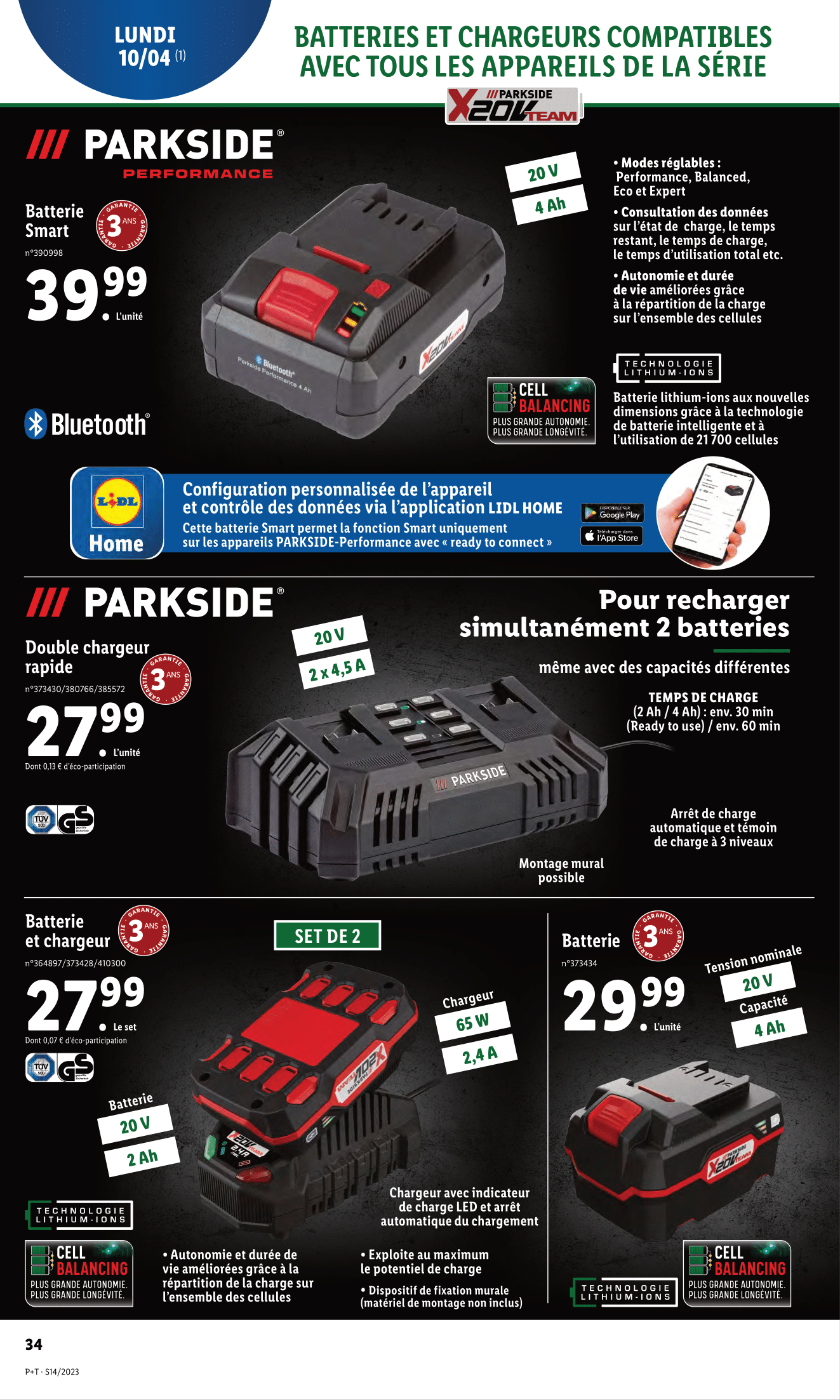Salut la compagnie, La gamme de bricolage Parkside performance est de retour chez Lidl ce lundi 10 avril 2023, on découvre ça de suite ! Et avant de découvrir les outils sans fil de la série x20team, jetons d’abord un œil sur les batteries et chargeurs. Au programme, on retrouvera la batterie smart Parkside performance 20v 4ah. Pour recharger simultanément 2 batteries même avec des capacités différentes, Lidl nous proposera également son double chargeur rapide Enfin, le set batterie et chargeur ou la batterie seule seront également au rendez-vous ce lundi 10 avril. Premier outil de ce lundi 10 avril, la scie sauteuse sans fil Parkside performance. Avec sa lampe de travail LED intégrée, ses 7 vitesses (une automatique + 6 réglables) et un raccordement possible à un système d’aspiration externe avec adaptateur inclus. Pour une coupe précise dans le bois, le plastique ou les matériaux légers comme les plaques de plâtre, Lidl ressort sa scie plongeante sans fil Parkside performance. Les lames de scie circulaire seront également présentes en rayon ! À retrouver également ce lundi 10 avril, la meuleuse d’angle sans fil Parkside performance, laquelle vous permettra de meuler, ébarber et tronçonner le métal, la pierre ou le carrelage. Avec 84% de surface d’ébarbage en plus. Attention tout de même, 2 batteries de 20 v sont impérativement nécessaires pour le fonctionnement de cette meuleuse. On poursuit avec l’indémodable perceuse-visseuse sans fil Parkside performance et son moteur puissant avec entraînement à 2 vitesses. Elle sera accompagnée de forets ou mèches, mais également d’outils à frapper et poinçons ou chasse-goupilles. Le set d’outils à frapper Comprenant : – 2 burins plats – 1 bédane de mécanicien – 2 poinçons – et 1 pointeau On poursuit ces arrivages avec le compresseur et pompe à air sans fil également vendu sans batterie ni chargeur Avec ses nombreuses utilisations possibles > compresseur pour haute pression d’air – préréglage de la pression > ou pompe à air pour les grands volumes – convient également pour le dégonflage On continue de s’équiper avec le pantalon de travail et les chaussures de sécurité s3 en cuir Parkside. Allez, on passe au jardinage maintenant, en commençant par la tondeuse sans fil Parkside et son bac d’env. 32 l Outil suivant, le coupe-bordures/taille-haies sans fil Parkside. Un appareil 2 en 1 pour des bordures nettes et des buissons parfaitement taillés. Il sera accompagné du nettoyeur à pression sans fil Parkside, qui sera en promotion pour l’occasion, -20% soit 40 euros au lieu de 50. Un appareil léger et mobile, idéal pour les zones sans raccordement à l’eau ou à l’électricité. Pour tailler les arbres et les arbustes et broyer les déchets végétaux, Lidl remettra en rayon sa mini-tronçonneuse à bois sans fil Parkside avec une longueur de coupe maximale d’env. 16 cm. Enfin on termine ces arrivages avec quelques promotions qui peuvent vous intéresser sur les produits de santé. -30% sur le tensiomètre de bras, pour la mesure oscillométrique entièrement automatique de la pression artérielle et du pouls au niveau du bras -30% sur l’oxymètre de pouls, pour mesurer la saturation En oxygène dans les artères et la fréquence cardiaque. Et de nouveau -30% sur le thermomètre multifonction, pour mesurer La température du corps dans l’oreille ou la température des objets et des liquides Et bien voilà, on a fait le tour de ces arrivages Lidl bricolage parkside du lundi 10 avril 2023. N’hésitez à me donner vos avis en commentaires, j’attends vos retours.