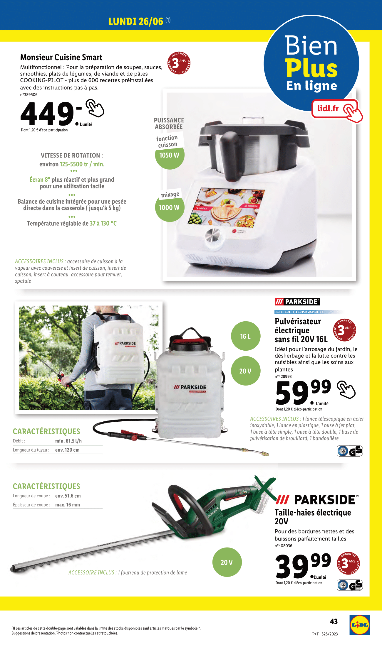 Salut la compagnie, C’est parti pour découvrir les nouveaux arrivages disponible sur le site lidl.Fr et croyez-moi, ça sent bon l’été ! On commence donc le jeudi 22 juin avec le kayak gonflable 3 personnes. Vous allez pouvoir explorer les lacs, les rivières ou même la mer, avec ce kayak comprenant un filet à bagages pratique permettant de transporter l’équipement en toute sécurité. Il est composé d’une surface auto-agrippante au fond pour ajuster le réglage des sièges. Enfin il est vendu avec ses accessoires : 2 pagaies doubles, pompe double action, sac à dos, 2 ailerons, 3 sièges de kayak et kit de réparation. Si vous préférez l’aventure sur l’eau tout en restant debout, Lidl proposera également son paddle race mistral. Facile à transporter grâce au format compact et au sac à dos pratique. Que ce soit pour faire du yoga paddle, explorer des criques isolés ou simplement vous détendre sur l’eau, ce paddle sera un excellent compagnon pour vos aventures aquatiques. Accessoires inclus : pagaie, pompe double action performance, sac à dos, dry bag d’env. 10 l, leash, set de réparation et aileron encliquetable. L’aventure très peu pour vous, je vous comprends, vous préférez vous détendre sur la plage. Ca tombe bien, puisque la tente pop-up de plage sera également disponible en ligne ! Vendue avec son sac de transport avec bandoulière pour un transport facile. Et on ne pouvait pas terminer ces arrivages en lignes du jeudi 22 juin, sans parler des maillots de bain. Ca sera donc short de bain pour hommes et maillot une pièce pour femme. Allez on passe aux arrivages du lundi 26 juin avec le retour de produits plutôt intéressants. D’abord le monsieur cuisine smart, inutile de représenter le dernier-né de la gamme des Monsieurs Cuisine Lidl, ce dernier sera votre meilleur allié en cuisine. Un produit multifonctionnel : pour la préparation de soupes, sauces, smoothies, plats de légumes, de viande et de pâtes avec plus de 600 recettes préinstallées. On poursuit avec du jardinage et la gamme Parkside. Le pulvérisateur électrique sans fil 20v 16 l Parkside performance débarque sur la boutique en ligne ce lundi 26 juin. En espérant d’ailleurs avoir de plus en plus d’outils de la gamme performance sur le site internet, parce que pour l’instant, c’est un peu la dèche, vous êtes d’accord avec moi ? Quoi qu’il en soit ce pulvérisateur sera idéal pour l’arrosage du jardin, le désherbage et la lutte contre les nuisibles ainsi que les soins aux plantes. Accessoires inclus : 1 lance télescopique en acier inoxydable, 1 lance en plastique, 1 buse à jet plat, 1 buse à tête simple, 1 buse à tête double, 1 buse de pulvérisation de brouillard et 1 bandoulière. Bon et celui-ci, on le connait bien, le taille-haies électrique 20v sera aussi disponible à la vente sur le site lidl.Fr, mais attention sans sa batterie. Idéal pour des bordures nettes et des buissons parfaitement taillés. Accessoire inclus : 1 fourreau de protection de lame Enfin, dernière vague d’arrivages en ligne, toujours ce lundi 26 juin 2023. Le rasoir Braun série 5 sera de retour. Il convient pour le rasage sur peau humide ou sèche. 3 lames flexibles qui s’adaptent aux contours du visage Autonomie : 50 minutes et temps de charge : 5 minutes Il y aura également le sèche-cheveux avec fonction ionique. Couleurs au choix entre bleu ou noir. Pour des cheveux soyeux et brillants. Temps de séchage réduit pour la protection des cheveux. Effet antistatique. On termine finalement coté salle de bain avec la douchette à main avec interrupteur à bascule et flexible, l’étagère d’angle de Douche télescopique et le mitigeur de baignoire ou robinet de douche. Voilà, on a fait le tour de ces arrivages en ligne Lidl du jeudi 22 et lundi 26 juin 2023. N’hésitez pas à me donner vos avis en commentaire, j’attends vos retours !