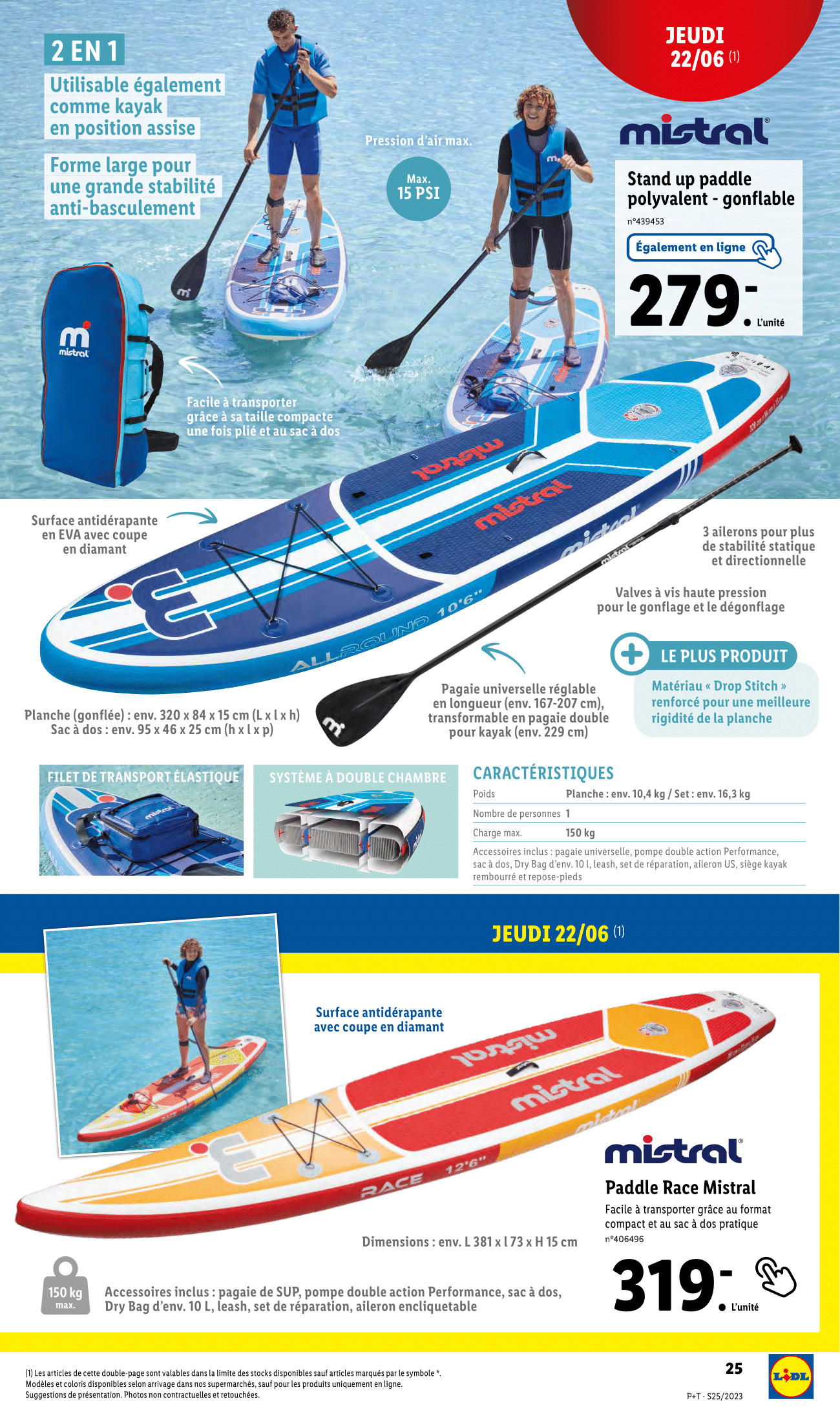 Salut la compagnie, C’est parti pour découvrir les nouveaux arrivages disponible sur le site lidl.Fr et croyez-moi, ça sent bon l’été ! On commence donc le jeudi 22 juin avec le kayak gonflable 3 personnes. Vous allez pouvoir explorer les lacs, les rivières ou même la mer, avec ce kayak comprenant un filet à bagages pratique permettant de transporter l’équipement en toute sécurité. Il est composé d’une surface auto-agrippante au fond pour ajuster le réglage des sièges. Enfin il est vendu avec ses accessoires : 2 pagaies doubles, pompe double action, sac à dos, 2 ailerons, 3 sièges de kayak et kit de réparation. Si vous préférez l’aventure sur l’eau tout en restant debout, Lidl proposera également son paddle race mistral. Facile à transporter grâce au format compact et au sac à dos pratique. Que ce soit pour faire du yoga paddle, explorer des criques isolés ou simplement vous détendre sur l’eau, ce paddle sera un excellent compagnon pour vos aventures aquatiques. Accessoires inclus : pagaie, pompe double action performance, sac à dos, dry bag d’env. 10 l, leash, set de réparation et aileron encliquetable. L’aventure très peu pour vous, je vous comprends, vous préférez vous détendre sur la plage. Ca tombe bien, puisque la tente pop-up de plage sera également disponible en ligne ! Vendue avec son sac de transport avec bandoulière pour un transport facile. Et on ne pouvait pas terminer ces arrivages en lignes du jeudi 22 juin, sans parler des maillots de bain. Ca sera donc short de bain pour hommes et maillot une pièce pour femme. Allez on passe aux arrivages du lundi 26 juin avec le retour de produits plutôt intéressants. D’abord le monsieur cuisine smart, inutile de représenter le dernier-né de la gamme des Monsieurs Cuisine Lidl, ce dernier sera votre meilleur allié en cuisine. Un produit multifonctionnel : pour la préparation de soupes, sauces, smoothies, plats de légumes, de viande et de pâtes avec plus de 600 recettes préinstallées. On poursuit avec du jardinage et la gamme Parkside. Le pulvérisateur électrique sans fil 20v 16 l Parkside performance débarque sur la boutique en ligne ce lundi 26 juin. En espérant d’ailleurs avoir de plus en plus d’outils de la gamme performance sur le site internet, parce que pour l’instant, c’est un peu la dèche, vous êtes d’accord avec moi ? Quoi qu’il en soit ce pulvérisateur sera idéal pour l’arrosage du jardin, le désherbage et la lutte contre les nuisibles ainsi que les soins aux plantes. Accessoires inclus : 1 lance télescopique en acier inoxydable, 1 lance en plastique, 1 buse à jet plat, 1 buse à tête simple, 1 buse à tête double, 1 buse de pulvérisation de brouillard et 1 bandoulière. Bon et celui-ci, on le connait bien, le taille-haies électrique 20v sera aussi disponible à la vente sur le site lidl.Fr, mais attention sans sa batterie. Idéal pour des bordures nettes et des buissons parfaitement taillés. Accessoire inclus : 1 fourreau de protection de lame Enfin, dernière vague d’arrivages en ligne, toujours ce lundi 26 juin 2023. Le rasoir Braun série 5 sera de retour. Il convient pour le rasage sur peau humide ou sèche. 3 lames flexibles qui s’adaptent aux contours du visage Autonomie : 50 minutes et temps de charge : 5 minutes Il y aura également le sèche-cheveux avec fonction ionique. Couleurs au choix entre bleu ou noir. Pour des cheveux soyeux et brillants. Temps de séchage réduit pour la protection des cheveux. Effet antistatique. On termine finalement coté salle de bain avec la douchette à main avec interrupteur à bascule et flexible, l’étagère d’angle de Douche télescopique et le mitigeur de baignoire ou robinet de douche. Voilà, on a fait le tour de ces arrivages en ligne Lidl du jeudi 22 et lundi 26 juin 2023. N’hésitez pas à me donner vos avis en commentaire, j’attends vos retours !
