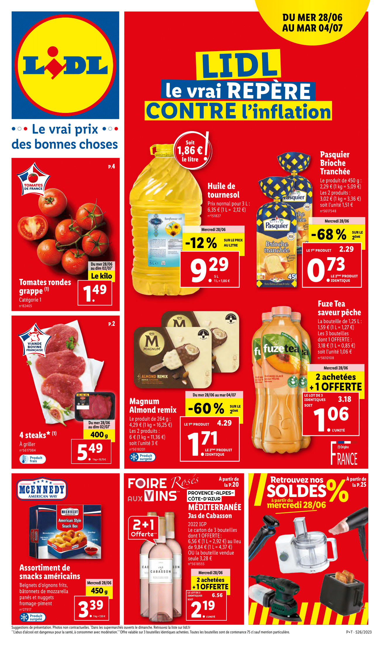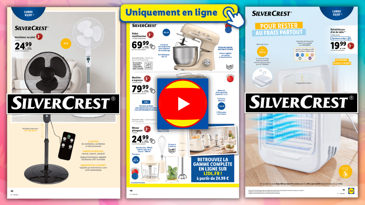 Salut la compagnie, Après avoir découvert les soldes Lidl, je vous remets la vidéo en description si vous êtes intéressés, on s’attaque maintenant aux arrivages en magasins et en ligne. Et, justement, c’est par les arrivages du site en ligne que l’on commence le jeudi 29 juin avec ce kit piscine steel pro avec pompe de filtration. Bien sûr, qui dit piscine dit maillot de bain. Vous pourrez donc retrouver des shorts de bain homme et des maillots de bain deux pièces pour femme sur le site Lidl. Toujours à retrouver en ligne uniquement, mais cette fois-ci à partir du lundi 3 juillet, c’est la gamme d’électroménager cuisine Silvercrest 1973. Alors pourquoi 1973 ? Eh bien pour la petite anecdote, c’est la date à laquelle Lidl s’est lancé sur le marché des magasins à prix cassé. Un petit clin d’œil sympathique donc, et personnellement j’aime beaucoup cet aspect vintage. N’hésitez pas à me dire ce que vous en pensé aussi en commentaire ! Vous l’avez ainsi vu, on retrouvera le robot multifonction (je vous invite d’ailleurs à regarder ma vidéo sur les soldes, car il y a une version de ce robot soldé à 44 euros). On retrouvera également la machine à expresso et le mixeur plongeant. À noter, que la gamme complète sera disponible sur le site lidl.Fr à partir de 25 euros, dès le lundi 3 juillet. Enfin, on termine ces arrivages en ligne avec la gamme de vêtements Lidl : sneakers adulte, chaussettes de sport, short de bain et mules de bain adulte. Bon là, on aime ou l’on n’aime pas. Tiens d’ailleurs donner moi votre avis, ça m’intéresse. L’avantage maintenant d’avoir ces produits en ligne, c’est que ça évitera aux petits malins de les revendre sur internet au double du prix ! Allez, on passe maintenant à l’habituelle sélection de plantes et de fleurs Lidl qui débutera le mercredi 28 juin et continuera le lundi 3 juillet. Le jeudi 29 juin, il n’y aura pas grand-chose en rayon du fait des soldes du mercredi 28 juin. C’est donc uniquement des vêtements d’été que vous retrouverez en magasins ce jeudi : d’abord rayon femme avec des t-shirts blouse, short, top, jean été, robe longue, robe et jupe. Coté homme, cela sera : chemise et short, mais également des pyjamas à la fois pour homme et pour femme, comme ça pas de jaloux ! On passe aux arrivages du lundi 3 juillet avec deux produits qui vont vous aider à supporter les fortes chaleurs de cet été. D’abord, le ventilateur sur pied, c’est du grand classique, mais ça dépanne toujours. 3 vitesses de ventilation, oscillation et télécommande 3 modes de réglage : normal, naturel et sommeil, ça, c’est pas mal parce qu’un ventilateur bruyant, c’est pénible. À voir donc si celui-ci est silencieux. Angle d’inclinaison réglable et oscillation à 85° activable Minuterie de 7,5 heures : réglable par demi-heures avec arrêt automatique Par contre, ici, j’ai plus de doute sur l’efficacité de ce rafraîchisseur d’air de table. Sur le papier ça l’air super, mais à ce prix-là, j’ai peur qu’il ne fasse que brasser de l’air. Bon, on termine ces arrivages du lundi 3 juillet avec des vêtements pour enfants aux couleurs de leurs héros Disney préférés. Enfin, pour conclure ce catalogue, voici les promotions du super weekend Lidl à retrouver du vendredi 30 juin au dimanche 2 juillet 2023. Voilà on fait le tour de ce catalogue Lidl de la semaine du mercredi 28 juin au mardi 4 juillet 2023. Bon ce n’était pas un catalogue très fourni, mais comme je vous le disais, c’est parce que Lidl a tout misé sur les soldes du mercredi 28 juin. En tout cas n’hésitez pas à me donner votre avis en commentaire et laisser un petit pouce en l’air si vous avez apprécié la vidéo.