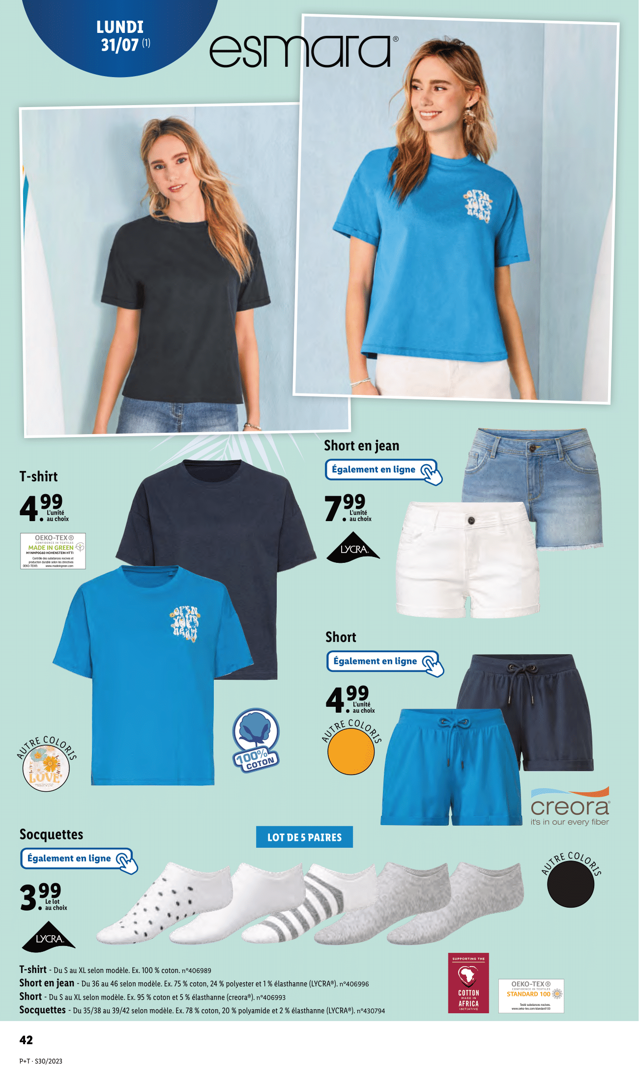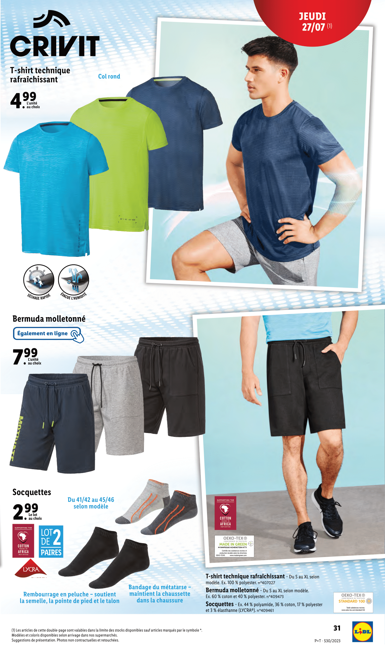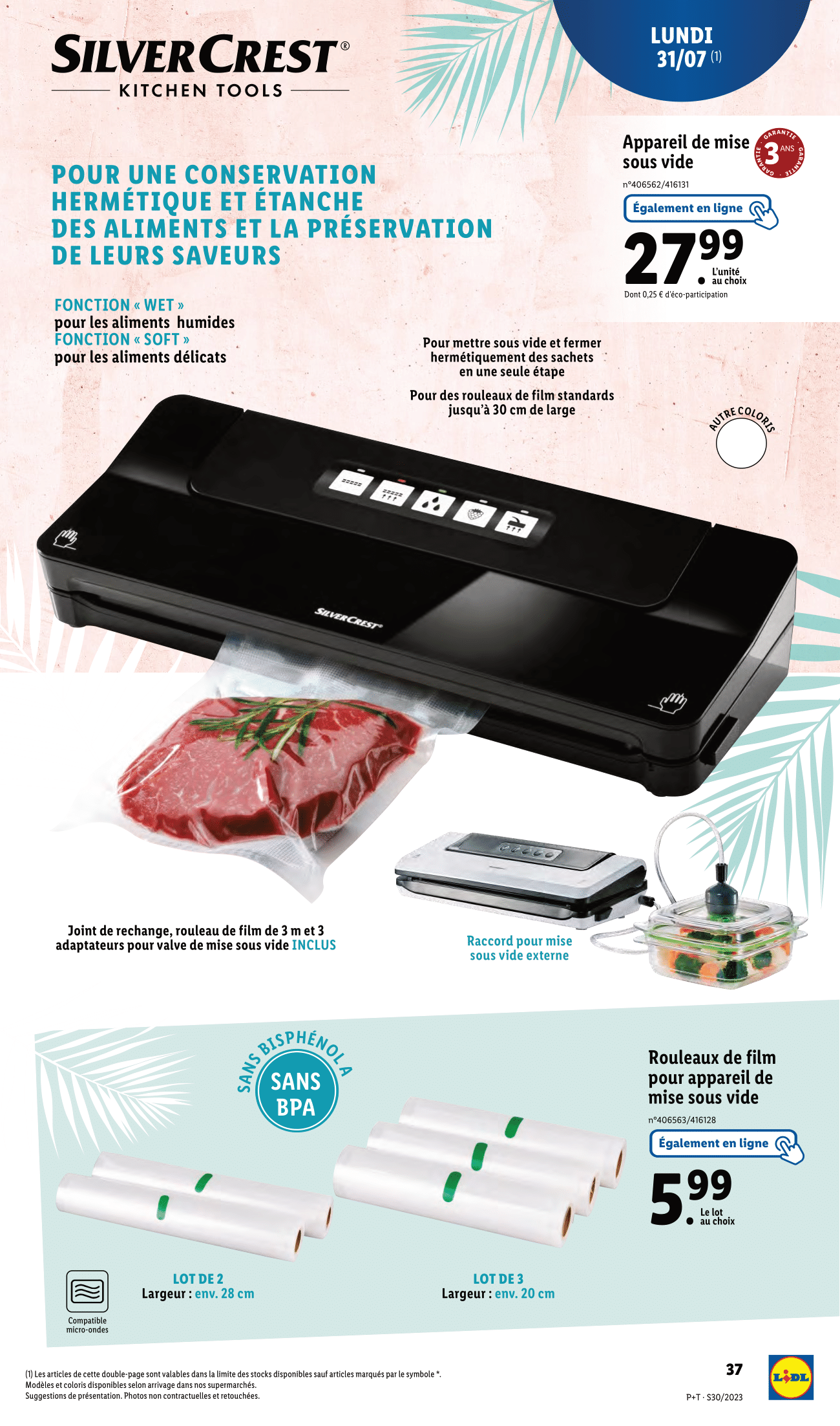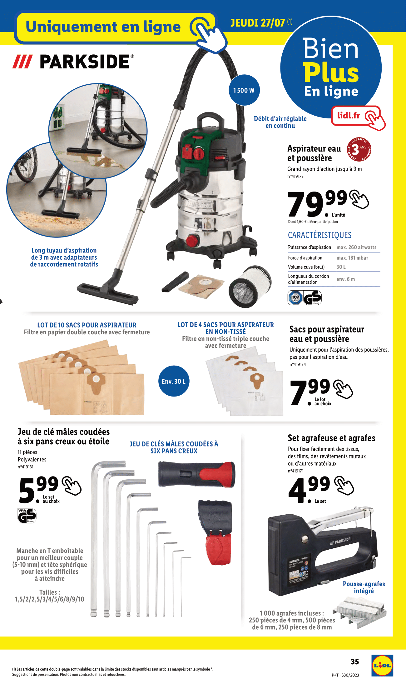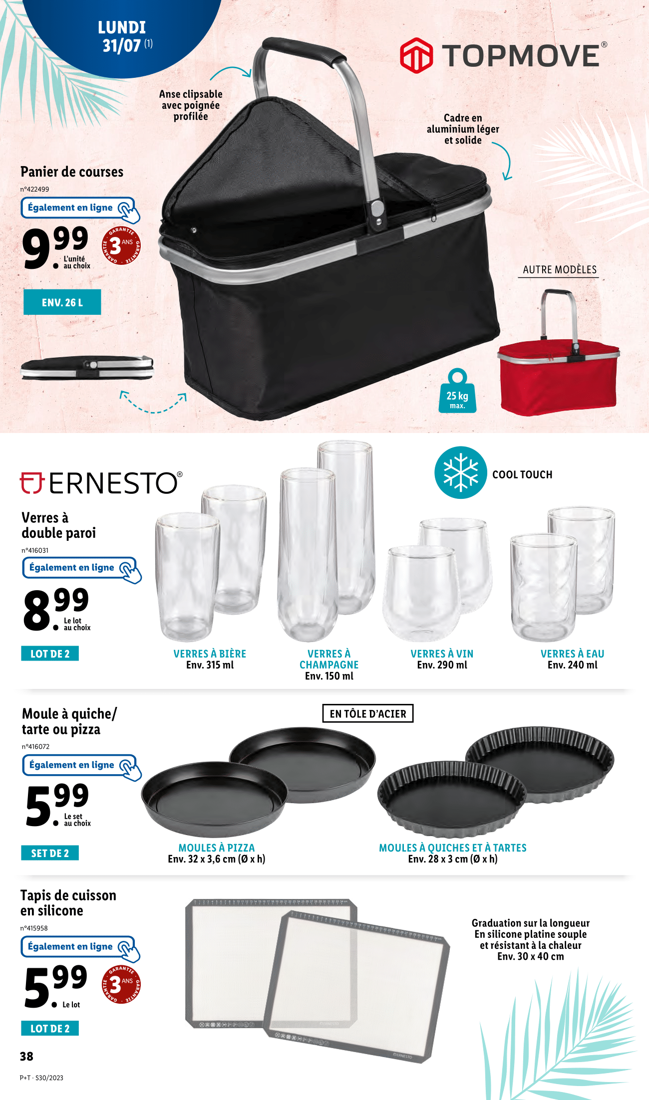 Salut la compagnie, Nouvelle semaine, nouveau catalogue Lidl avec des arrivages à retrouver du mercredi 26 juillet au mardi 1er août 2023. Au programme de ce catalogue, on retrouvera la gamme de bricolage et de jardinage Parkside, les produits Crivit pour le sport, de l’électroménager SilverCrest pour se préparer de bons petits plats ainsi qu’une tonne de vêtement pour cet été ! Justement, j’ai ajouté les alternatives aux produits de ce catalogue sur ma vitrine Amazon, le lien est dans la description. Pour l’heure, on commence avec l’habituelle sélection de plantes et de fleurs Lidl à retrouver dès le mercredi 26 juillet. Et ça sent bon dans l’air avec de nombreuses promotions. D’abord sur les œillets parfumés, pour 2 achetés le troisième est offert. -35% sur la deuxième plante fleurie achetée Et -20% sur le deuxième platycodon ou la deuxième bouvardia achetée. Ce n’est pas terminé coté promotion, puisqu’il y aura aussi -20% sur l’achat d’une deuxième composition d’été et -35% sur l’achat d’un deuxième rosier ou succulente en pot céramique. Sinon, lidl nous proposera également en rayon son bouquet de fleurs séchées en vase, plante verte en corbeille, laurier rose et sempervivum. Enfin cette sélection fleurie continuera le lundi 31 juillet avec le palmier de jardin, cycas ou livistona ainsi qu’une promotion de -30% pour l’achat d’un deuxième canna indica. On passe aux arrivages Parkside du jeudi 27 juillet en commençant par le coupe-bordures/taille-haies sans fil. Un outil 2 en 1 pour des bordures nettes et des buissons parfaitement taillés. Sinon, on retrouvera également en rayon l’agrafeuse électrique et le tournevis électrique sans fil. On continue avec l’outil à frapper et poinçons ou chasse-goupilles, l’étai et sa surface d’appui caoutchoutées pour ne pas abîmer les surfaces sensibles ainsi que du vernis, au choix : noir brillant, blanc brillant, transparent brillant ou transparent satiné. Enfin pour aligner vos objets au millimètre près, le niveau à bulle laser Parkside sera de retour dans les baques chez lidl. Avec 2 nivelles tubulaires éclairées, laser et éclairage de la nivelle activables séparément et aimants intégrés. Prêts à transpirer ?! C’est l’heure de notre séance de sport avec la gamme Crivit. On commence avec le brassard pour smartphone ou ceinture de running avec 2 compartiments pour ranger séparément le smartphone et les clés. Sinon il y aura aussi les lunettes de sport avec verres auto-teintant, version sans monture, à monture intégrale ou demi-lune. Rayon femme, Lidl proposera ses brassières de sport rafraîchissante, legging technique rafraîchissant et socquettes. Pour enregistrer le nombre de pas, les calories brûlées, le temps d’activité et analyser le sommeil, Lidl nous ressort son capteur d’activité. 14 jours d’autonomie en veille 7 jours en fonctionnement 14 modes de sport au choix Il enregistre l’objectif d’activité quotidien et mémorise les mouvements Coté vêtements pour homme, les rayons seront garnis des t-shirts technique rafraîchissant, bermuda molletonné et socquettes. Enfin, pour vos exercices de fitness, vous allez pouvoir vous aider du tapis de fitness, bandes élastiques de fitness et matériel de fitness à savoir bandes de fitness, corde à sauter lestée ou plateau d’équilibre. Allez on monte d’un cran avec ce rameur à eau Crivit qui sera disponible en ligne uniquement et toujours ce jeudi 27 juillet ! Avec support pivotant pour tablette/smartphone, intensité d’entraînement réglable, capacité de remplissage max du réservoir d’eau d’environ 16 l, connexion sans fil via Bluetooth (5.0) avec des applications et pliable pour un rangement facile. On reste sur la boutique en ligne, mais de nouveau avec un arrivage Parkside, cette fois sur les vêtements de travail avec la salopette de travail, t-shirts, chaussettes et chaussures de sécurité. Ce n’est pas tout du côté de la boutique en ligne Lidl puisque l’aspirateur eau et poussière Parkside sera proposé à la vente accompagné des sacs pour aspirateur eau et poussière, du jeu de clé mâles coudées à six pans creux ou étoile ainsi que du set agrafeuse et agrafes. Lundi 31 juillet, on file au rayon cuisine avec les couteaux de cuisine de la gamme Ernesto, les sets de saladiers et les coupes-fruit au choix coupe-ananas, coupe-mangue et coupe-pastèque. Pour une conservation hermétique et étanche des aliments et la préservation de leurs saveurs, vous le connaissez surement c’est l’indémodable appareil de mise sous vide qui sera de retour en rayon ce lundi. On retrouvera aussi logiquement les rouleaux de film pour appareil de mise sous vide. Pour faire vos courses chez Lidl ou autres, vous avez ce panier de courses Top Move. Sinon, il y aura aussi une large sélection de verres à double paroi permettant une meilleure conservation du froid. Au choix, verres à bière, verres à champagne, verres à vin et verres à eau. Bon pour les verres à champagnes et à vin, ce n’est pas vraiment les modèles conventionnels, mais pourquoi pas… Pour réaliser vos meilleures quiches, tartes ou pizzas, vous avez ces moules en tôle d’acier. Enfin, on retrouvera également les tapis de cuisson en silicone. Pas de place pour un barbecue ou pas envie d’investir autant pour des grillades, vous pouvez opter pour ce petit gril de table électrique, ça fera l’affaire surtout si vous n’êtes pas nombreux. Si vous êtes à la recherche de souliers pour cet été, vous trouverez peut-être chaussures à votre pied avec les sneakers et sandales pour homme et les ballerines pour femme. On continue notre relooking pour cet été, d’abord rayon homme avec les t-shirts, bermuda en sweat denim, socquettes et chaussures. Rayon femme, c’est à peu près pareil avec les t-shirts, short en jean, short et socquettes. Mais, c’est loin d’être fini pour v