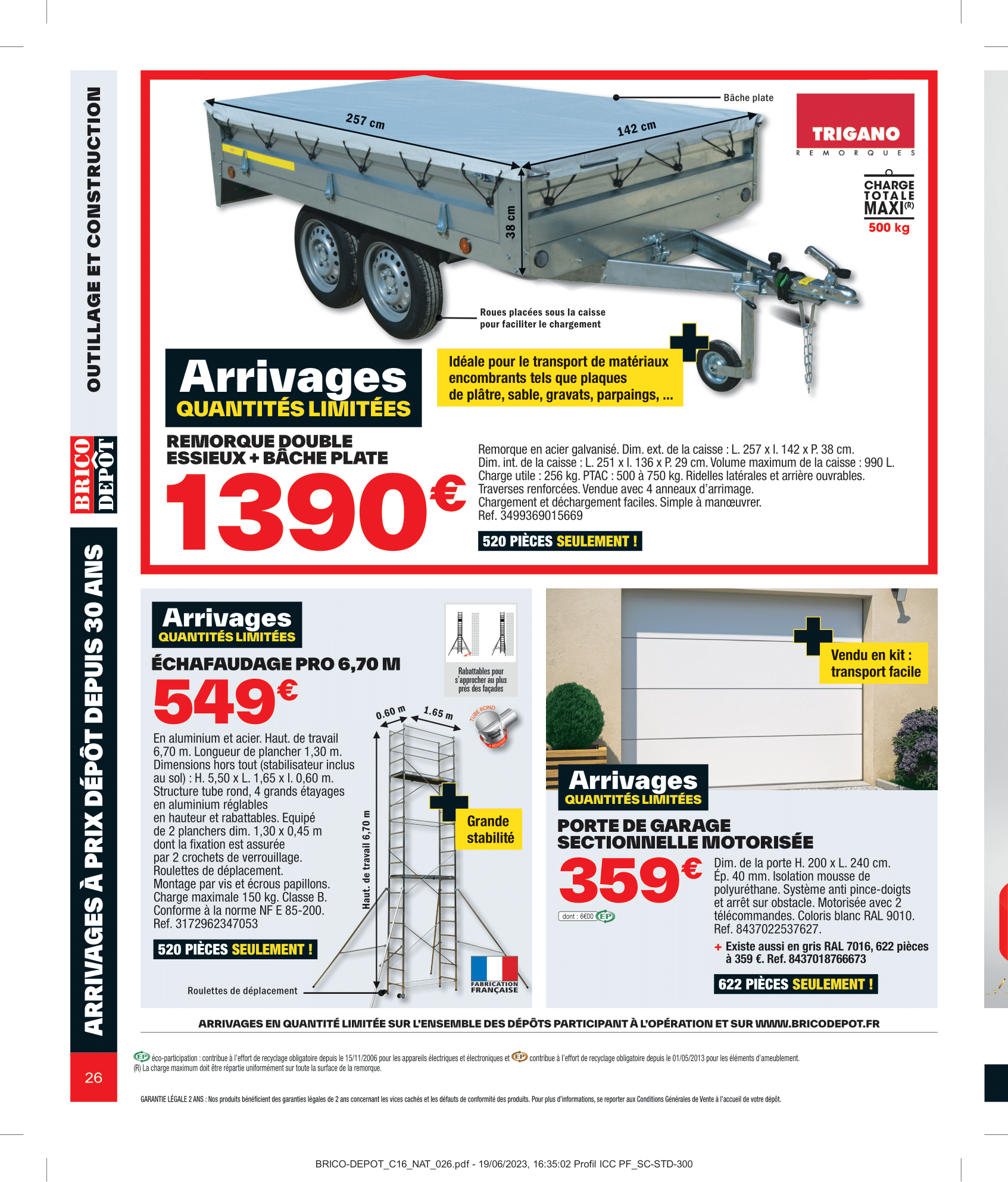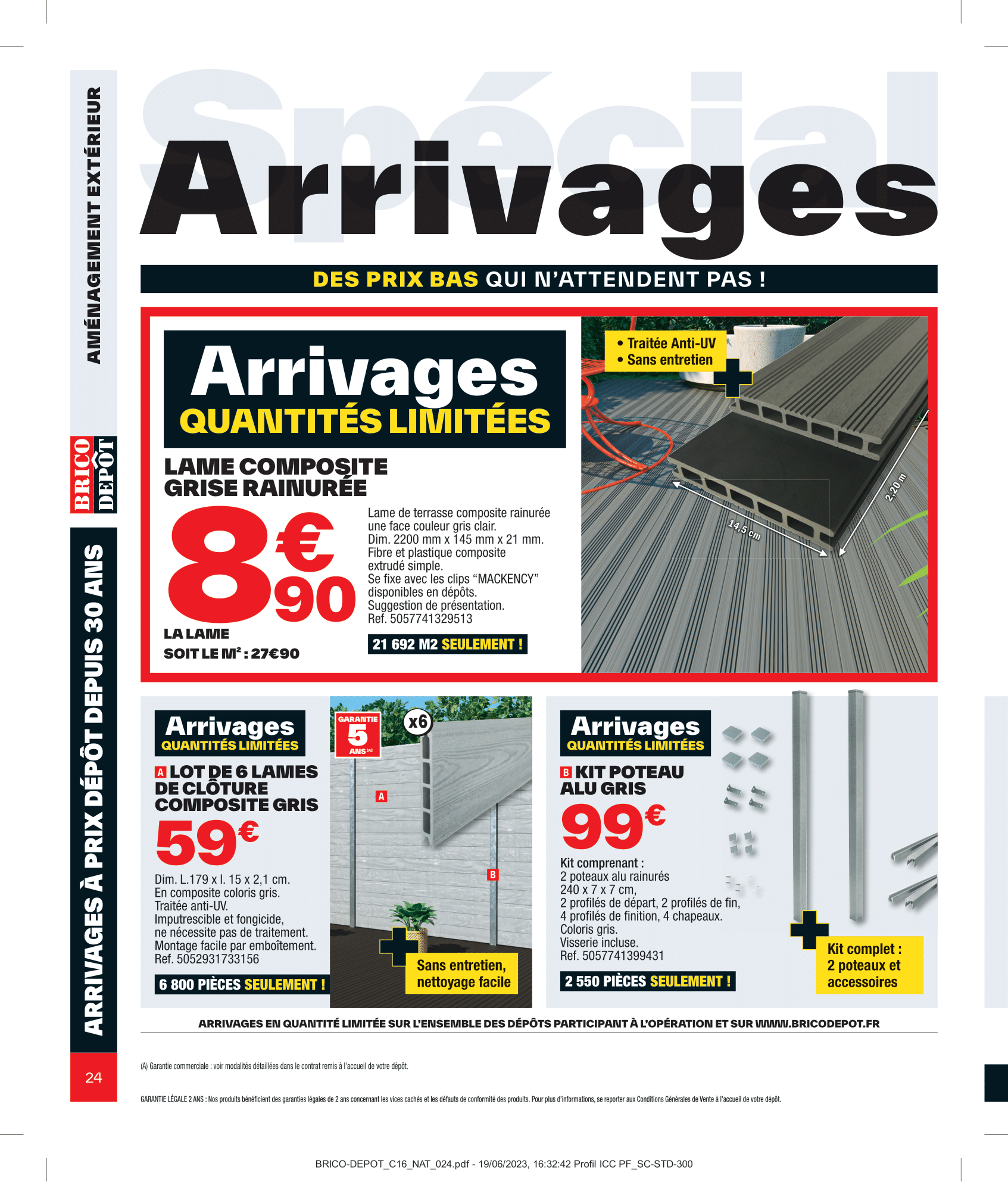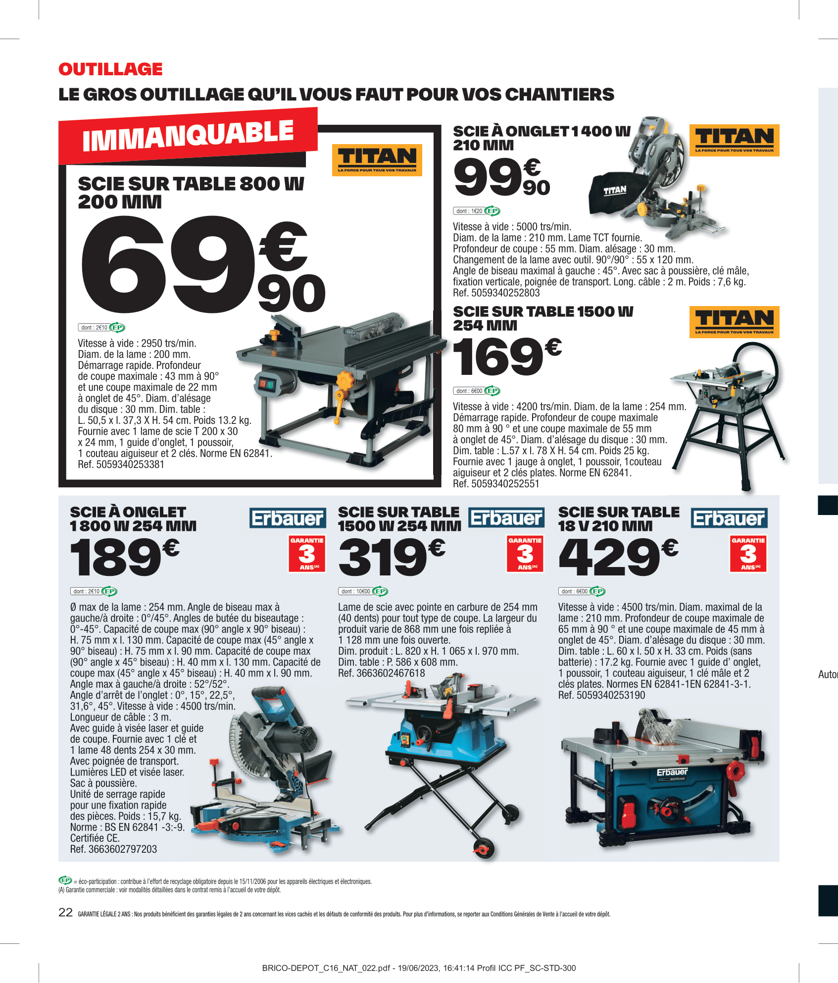 Salut la compagnie, C’est parti pour découvrir le nouveau catalogue Brico Dépôt avec des arrivages à retrouver du vendredi 21 juillet au jeudi 10 août 2023. Aménagement intérieur, extérieur, outillage et sol, on va tout regarder ensemble dans cette vidéo. On commence donc par les aménagements d’extérieurs avec les lames composites grise rainurée, mais également le lot de 6 lames de clôture composite gris accompagné du kit poteau alu gris. Pour ranger outils de jardinage, jeux d’extérieur et tout le tintouin, Brico Dépôt nous ressort son abri en bois. Coté sol, il y aura des planches en pin et dalle en bois brun. Rayon outillage et construction, on retrouvera en magasin la remorque double essieu + bâche plate. Idéale pour le transport de matériaux encombrants tels que les plaques De plâtre, sable, gravats, parpaings…, Sinon il y aura aussi l’échafaudage pro 6,70 m ainsi que la porte de garage sectionnelle motorisée. Pour entreposer votre matos le plus lourd, vous pourrez compter sur l’étagère pro charge lourde bois/métal pouvant supporter jusqu’à 300kg sur chaque tablette. Multiples renforts. À clipser : montage facile. Épaisseur tablette de 15 mm pour plus de solidité. Bac acier et panneau polyuréthane pour les murs seront également de la partie. Préparez-vous à être scié, Brico Dépôt nous propose les scies sur table ou scie à onglet, en différents modèles à la fois Titan et Erbeauer. Coté compresseur et groupe électrogène, on retrouvera également une jolie sélection. Rayon électricité, il y aura les couronnes de câble, tableau prééquipé et précâblé 4 rangées ainsi que la mallette 130 bornes mixtes. On passe aux aménagements intérieur maintenant avec le sèche-serviettes barres plates “Melor” 500 w avec soufflerie intégrée 1 000 w Il y aura aussi les portes coulissante atelier vitrage opale ou verrière noire 4 panneaux vitrage opale. Idéal pour obtenir occultation et luminosité. Attention où vous mettez les pieds, voici le carrelage de sol intérieur. On file derrière les fourneaux maintenant avec le plan de travail stratifié, le lot de 2 tabourets de bar avec pieds réglables en hauteur, lave-vaisselle compact avec départ différé : 1-24 h et micro-ondes encastrable 25 l noir avec cavité intérieure plate pour un nettoyage facile. On termine finalement ce catalogue par le pack WC suspendu. Eh bien voilà, on a fait le tour de ces arrivages Brico Dépôt du vendredi 21 juillet au jeudi 10 août 2023. N’hésitez pas à me donner vos avis en commentaire, j’attends vos retours !