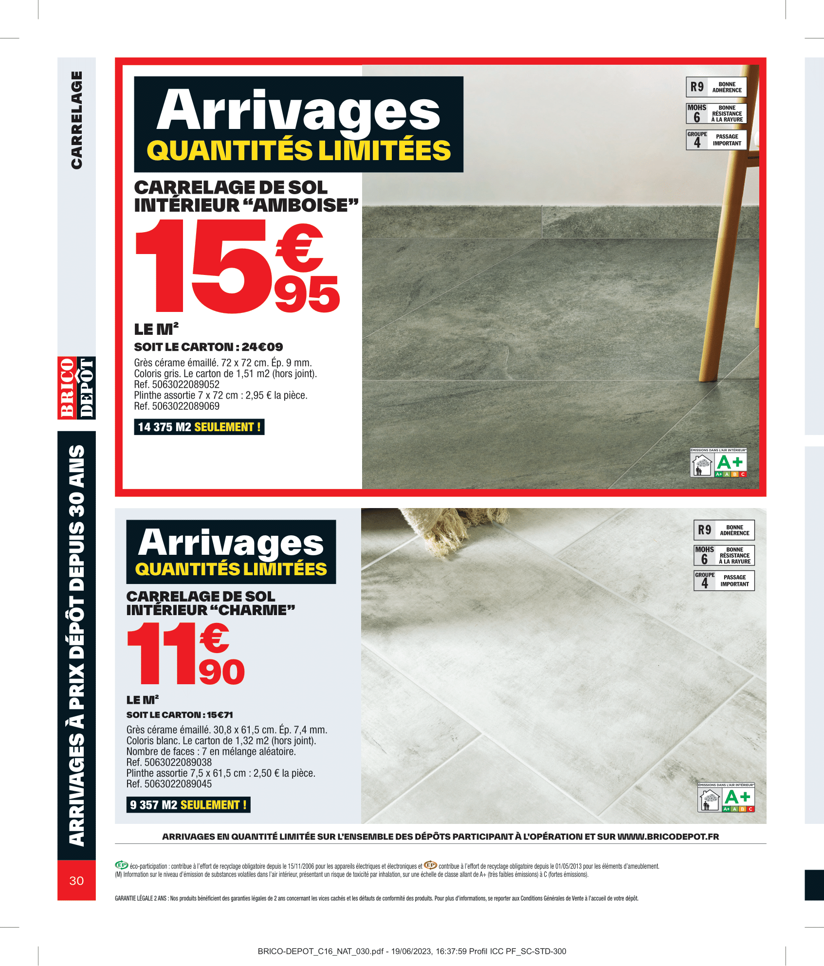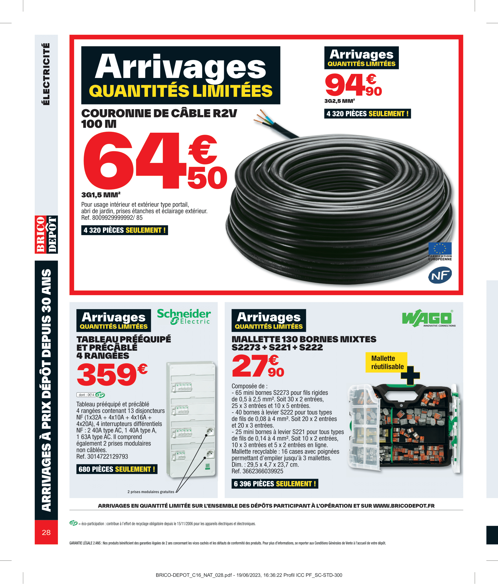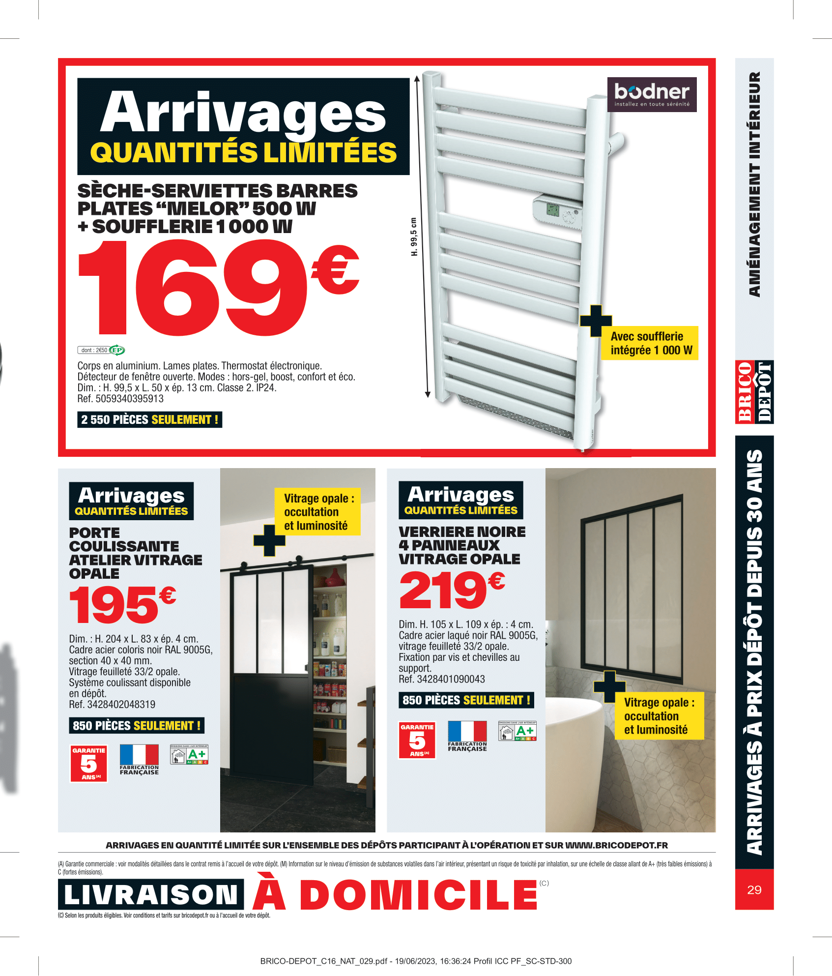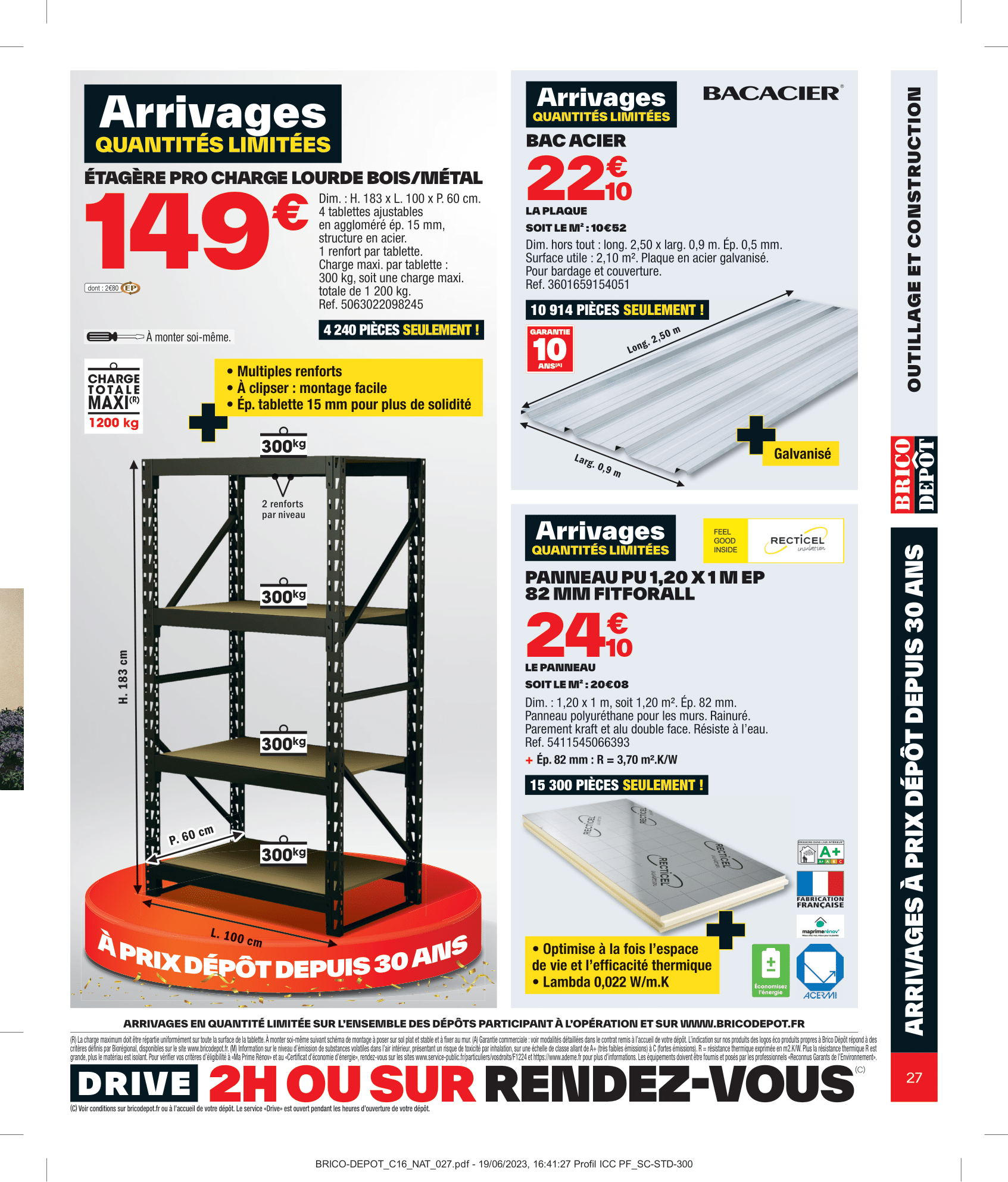 Salut la compagnie, C’est parti pour découvrir le nouveau catalogue Brico Dépôt avec des arrivages à retrouver du vendredi 21 juillet au jeudi 10 août 2023. Aménagement intérieur, extérieur, outillage et sol, on va tout regarder ensemble dans cette vidéo. On commence donc par les aménagements d’extérieurs avec les lames composites grise rainurée, mais également le lot de 6 lames de clôture composite gris accompagné du kit poteau alu gris. Pour ranger outils de jardinage, jeux d’extérieur et tout le tintouin, Brico Dépôt nous ressort son abri en bois. Coté sol, il y aura des planches en pin et dalle en bois brun. Rayon outillage et construction, on retrouvera en magasin la remorque double essieu + bâche plate. Idéale pour le transport de matériaux encombrants tels que les plaques De plâtre, sable, gravats, parpaings…, Sinon il y aura aussi l’échafaudage pro 6,70 m ainsi que la porte de garage sectionnelle motorisée. Pour entreposer votre matos le plus lourd, vous pourrez compter sur l’étagère pro charge lourde bois/métal pouvant supporter jusqu’à 300kg sur chaque tablette. Multiples renforts. À clipser : montage facile. Épaisseur tablette de 15 mm pour plus de solidité. Bac acier et panneau polyuréthane pour les murs seront également de la partie. Préparez-vous à être scié, Brico Dépôt nous propose les scies sur table ou scie à onglet, en différents modèles à la fois Titan et Erbeauer. Coté compresseur et groupe électrogène, on retrouvera également une jolie sélection. Rayon électricité, il y aura les couronnes de câble, tableau prééquipé et précâblé 4 rangées ainsi que la mallette 130 bornes mixtes. On passe aux aménagements intérieur maintenant avec le sèche-serviettes barres plates “Melor” 500 w avec soufflerie intégrée 1 000 w Il y aura aussi les portes coulissante atelier vitrage opale ou verrière noire 4 panneaux vitrage opale. Idéal pour obtenir occultation et luminosité. Attention où vous mettez les pieds, voici le carrelage de sol intérieur. On file derrière les fourneaux maintenant avec le plan de travail stratifié, le lot de 2 tabourets de bar avec pieds réglables en hauteur, lave-vaisselle compact avec départ différé : 1-24 h et micro-ondes encastrable 25 l noir avec cavité intérieure plate pour un nettoyage facile. On termine finalement ce catalogue par le pack WC suspendu. Eh bien voilà, on a fait le tour de ces arrivages Brico Dépôt du vendredi 21 juillet au jeudi 10 août 2023. N’hésitez pas à me donner vos avis en commentaire, j’attends vos retours !